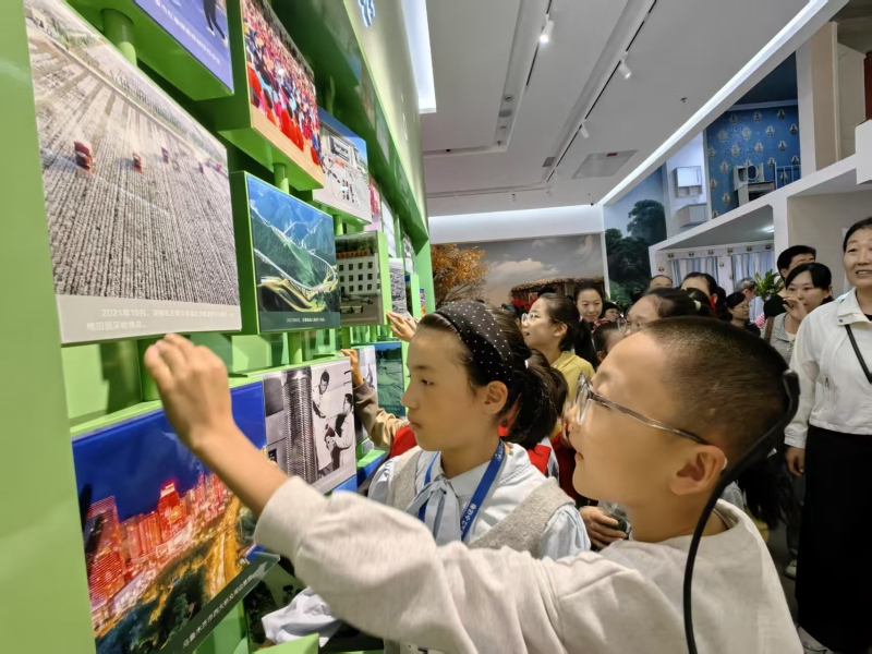 小记者们翻看照片墙,感受自治区成立70年来的发展变化。 走到“潮涌天山展宏图”展区,众多实物与模型瞬间吸引了大家的注意力。当讲解老师聊起“西气东输”工程,说新疆的天然气正为许多疆外城市供能时,乌鲁木齐市第88中学的石榴云小记者申若滢立刻提笔记录,语气里满是自豪:“没想到新疆的天然气能送到疆外,这也太了不起了!”