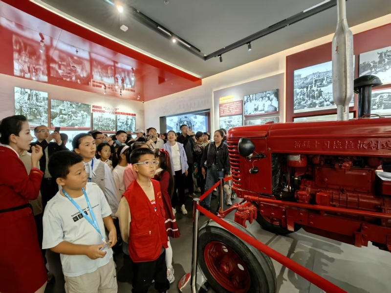 石榴云小记者参观红色老式拖拉机。 展区内,“交通网络变迁墙”让小记者们连连惊叹——从坑洼难行的土路到纵横交错的高速公路,从慢节奏的绿皮火车到飞驰而过的高铁,一张张图片串联起新疆“天堑变通途”的跨越。不少小记者掏出手机拍照,想把这份“震撼”分享给班里的同学。 两个多小时的参观中,小记者们时而低头认真记录,时而举手踊跃提问。许多媒体视频和场景还原项目,把抽象的“成就”变成了可触摸、可感知的“故事”。走出展厅时,夕阳为展馆镀上一层金边,小记者们纷纷说,要把这次的所见所闻写成稿件,让更多人知道新疆70年的变化,也立志长大后为家乡发展出一份力。