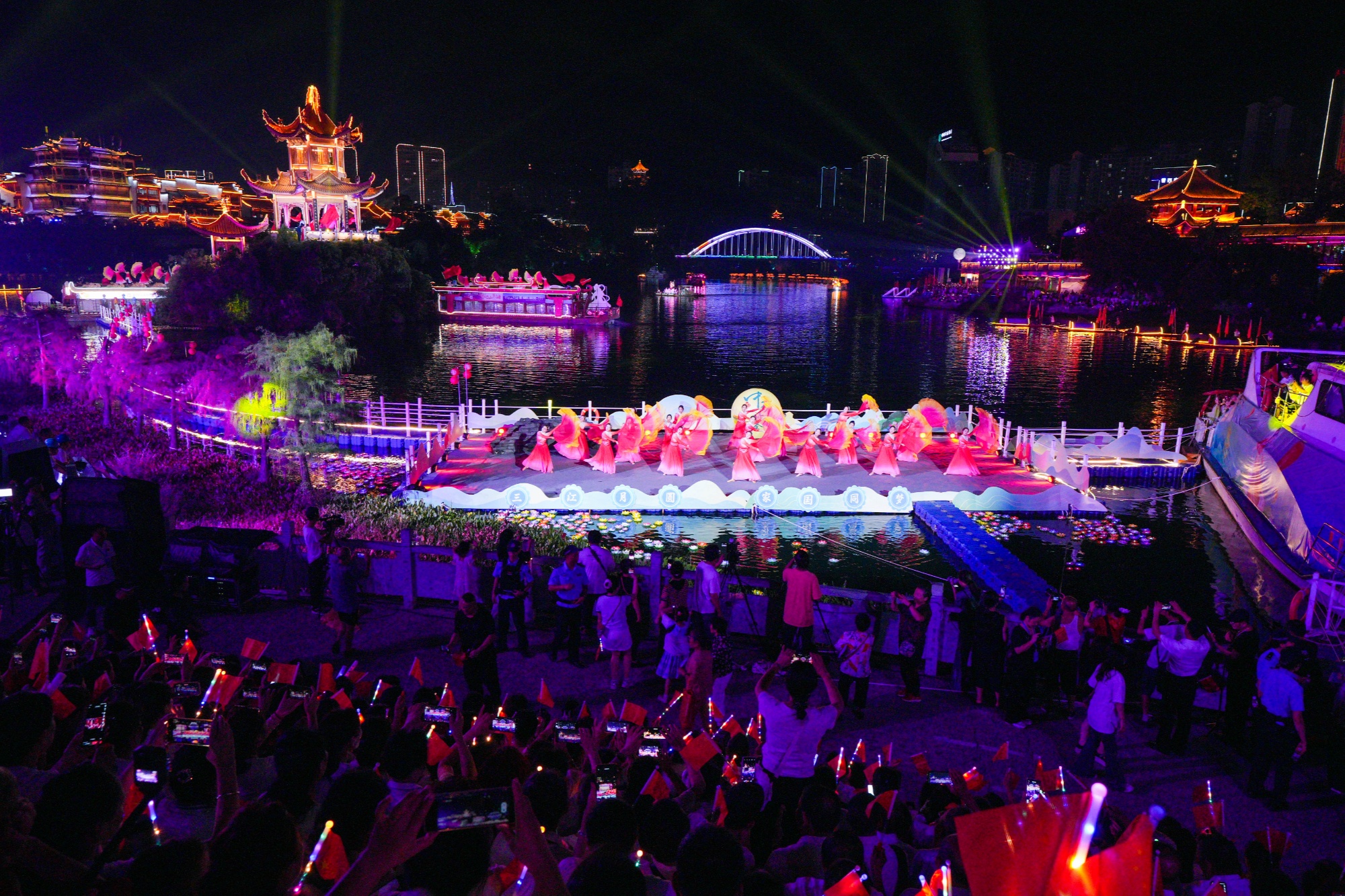 月满三江映华诞,诗颂家国聚铜城。10月1日晚,贵州省铜仁市“三江月圆·家国同梦”2025年国庆·中秋诗会在三江公园水域精彩启幕。