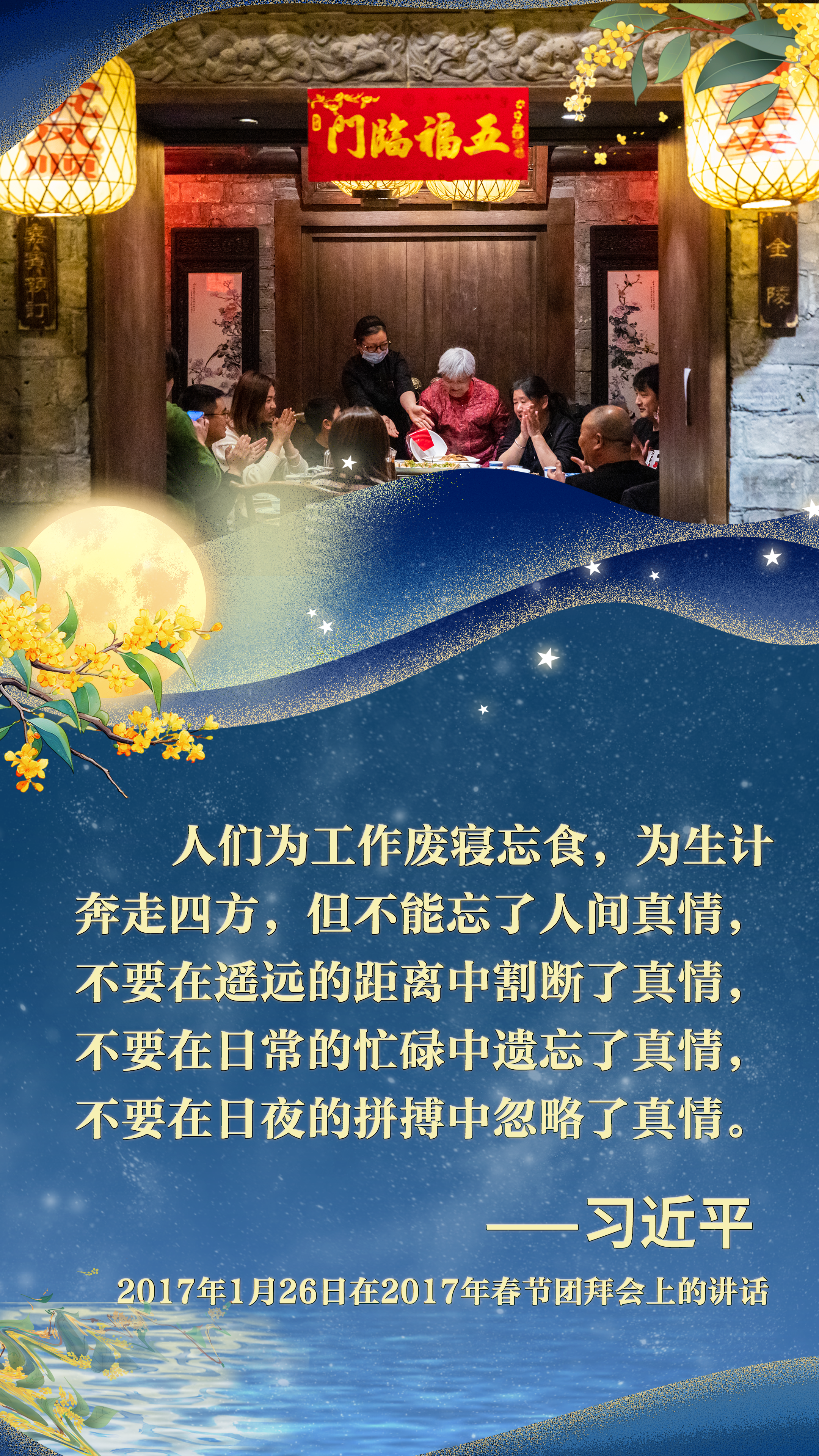 “海上生明月,天涯共此时。” 中秋的皎洁圆月,映照着千家万户的灯火,也牵动着跨越山河的思念。  2015年9月23日,中秋佳节前夕,习近平总书记在西雅图出席美国侨界欢迎招待会。他为参加招待会的同胞们带去了来自家乡的月饼,并热情地“欢迎大家常回家看看”。 中华民族历来重真情、尚大义。当今社会快速发展,人们为生计奔走四方,但不能忘了人间真情。  “但愿人长久,千里共婵娟。” 中秋佳节,自古以来寄托着中华儿女对家最深切的乡愁、对国最深沉的依恋。  家是最小国,国是千万家。 今年,中秋佳节,恰逢国庆假期,爱家爱国同频、家国情怀共融。  江山万重,皓月千里。刻在中华儿女骨血里的家国情怀,让每一次团聚都成为对美好生活的礼赞,让每一份祝福都汇聚成民族奋进的磅礴力量。 统筹:吴炜玲、张桂林 编导:王雅璇 记者:李爱斌 海报:杨震男 新华社音视频部制作