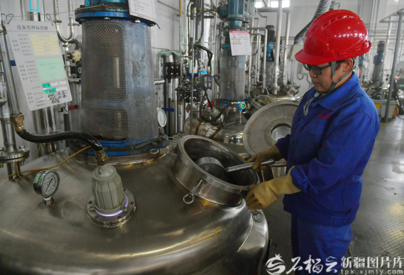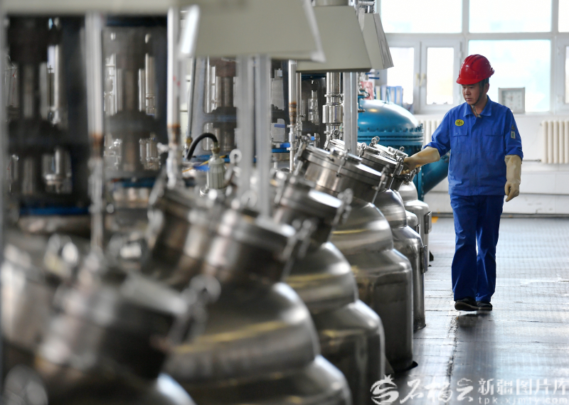 10月13日,新疆天山制药工业有限公司工作人员查看生产设备运行情况。