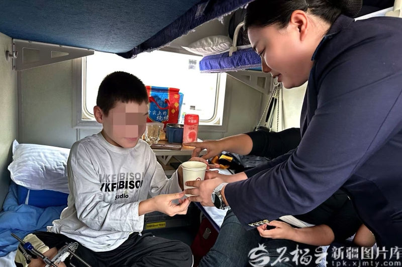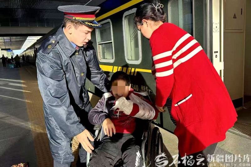 10月14日,和田站站台,T9526次列车工作人员与孩子家长协作,小心翼翼地将坐在轮椅上的术后儿童从列车上抬下来。袁志萍摄 据了解,这11名患儿此前参加了2025年中央财政支持社会组织参与社会服务项目“携手同行——新疆、西藏、青海困境儿童骨病肢救助项目”,前往上海接受手术。10月13日,他们乘坐Z304次列车抵达乌鲁木齐站后,由乌鲁木齐站工作人员专人转送至T9526次列车。 列车从乌鲁木齐站出发后,乘务员们的特别守护随即开启。列车班组提前30分钟做好准备:在孩子们的指定铺位旁悬挂“天山雪莲”爱心标识,方便全程重点关注,同时安排经验丰富的乘务员为孩子们服务。 “小朋友,刀口疼不疼?”每隔1小时,乘务员就会来到孩子们的铺位前,询问身体状况。到了用餐时间,乘务员提前加热餐食,端到铺位旁协助家长照料用餐。夜间行车时,乘务员巡查车厢,查看孩子们有没有盖好被子。遇到一名手臂仍缠着纱布的孩子,乘务员从列车医药箱里拿出无菌棉签,手把手教家长清洁刀口周围,保持干净卫生。