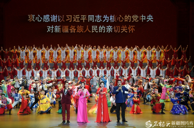 为庆祝新疆维吾尔自治区成立70周年,文艺晚会《美丽新疆》在乌鲁木齐文化中心大剧院隆重上演,奉献了一场铸牢中华民族共同体意识的文化盛宴。
