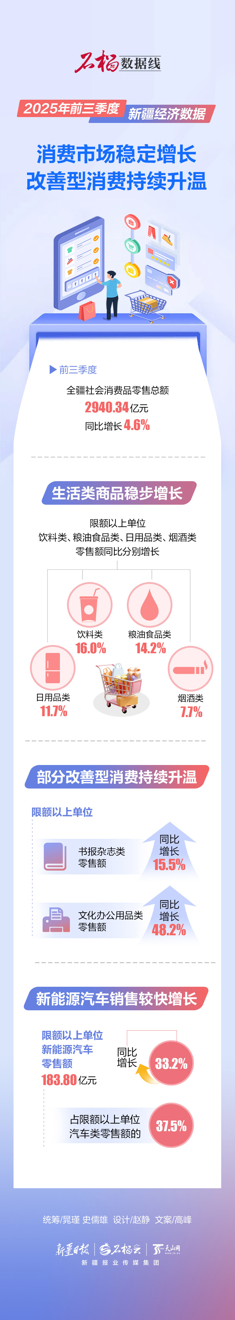 2025年前三季度,全疆社会消费品零售总额2940.34亿元,同比增长4.6%。 生活类商品稳步增长,限额以上单位饮料类、粮油食品类、日用品类、烟酒类零售额同比分别增长16.0%、14.2%、11.7%、7.7%。 部分改善型消费持续升温,限额以上单位书报杂志类、文化办公用品类零售额同比分别增长15.5%、48.2%。 新能源汽车销售较快增长,限额以上单位新能源汽车零售额183.80亿元,同比增长33.2%,占限额以上单位汽车类零售额的37.5%。 统筹:晁瑾 史儒雄 设计:赵静 文案:高峰