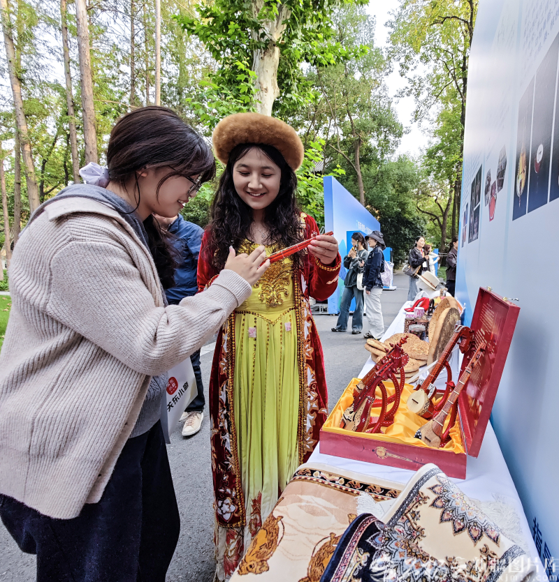 10月27日,南京师范大学随园校区,一名南京师范大学的学生在了解新疆的乐器。