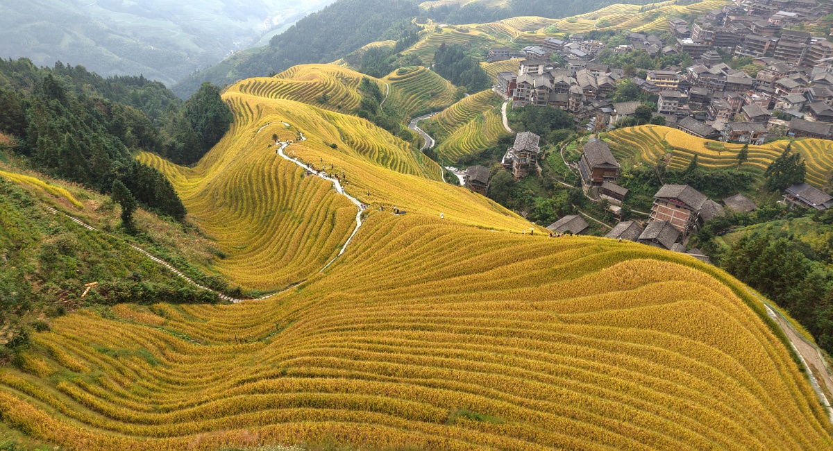丰收时节,一定要来一趟桂林龙脊梯田。成熟的稻穗随风摇曳,将连绵山体染成金色,从山脚延伸至山顶的田垄宛如大地指纹,尽显桂北乡村的丰收盛景。走进这幅金色的油画,沉醉在浓浓的秋日氛围里。