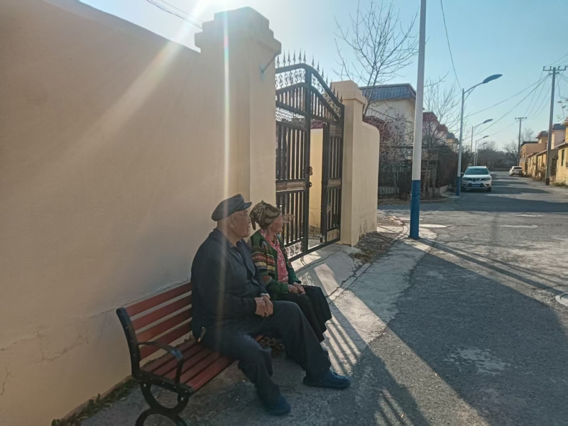 10月25日,在乌鲁木齐市乌拉泊社区的一处街角,居民卡山老人正陪着老伴坐在崭新的靠椅上,享受着午后的暖阳。