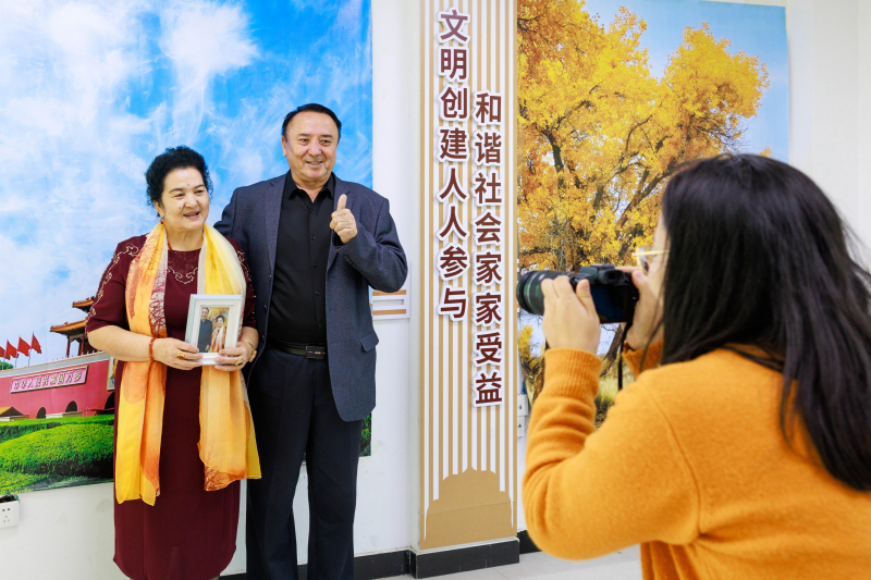10月24日,乌鲁木齐市天山区南湾街街道中环路南社区举行“爱满重阳节 情暖老人心”活动。党员志愿者为老人拍照,送去关爱和祝福。