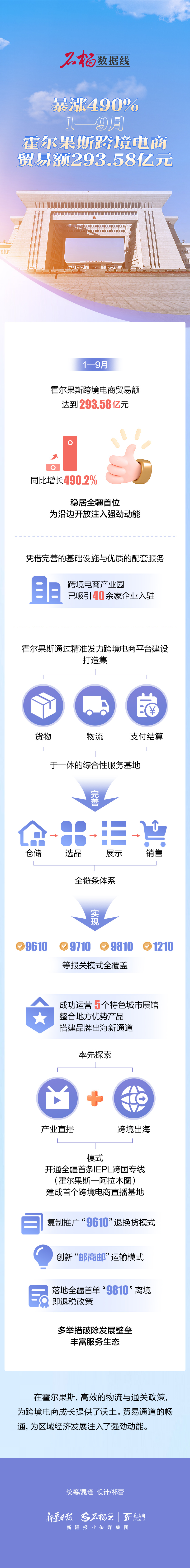 1—9月霍尔果斯跨境电商贸易额达到293.58亿元,同比增长490.2%,稳居全疆首位。