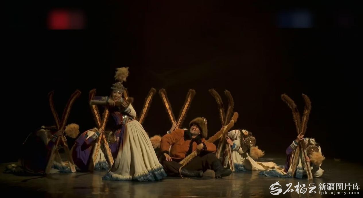 舞台远景,一个个如古老岩画中走出的白色“雪人”正用各种姿态从起伏的群山上滑雪。近景中,一位工匠正在制作毛皮滑雪板。随着音乐响起,姑娘小伙们用雪板做道具,在“黑走马”的欢快节奏中,将舞台变成阿勒泰的冰天雪地,热烈奔放的舞蹈演绎出一场雪地狂欢……