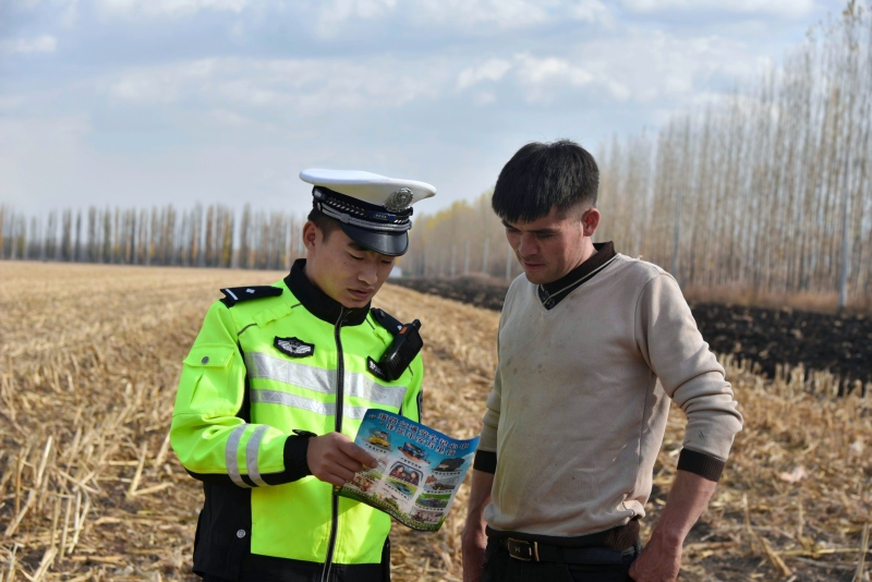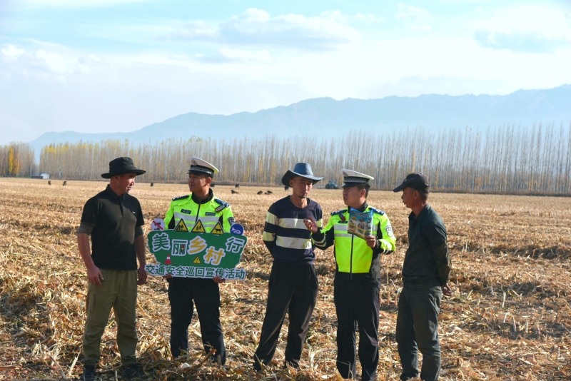 民警在休息时间给农户进行安全知识讲解。通讯员 马燕摄 石榴云/新疆法治报记者 李续群 通讯员 马宏才 10月28日,新源县公安局交通管理大队组织民辅警深入秋收一线,开展“美丽乡村行”交通安全宣传活动。 “老乡,您这拖拉机夜间行驶视线不好,贴上反光条,远远就能被看到,安全更有保障。”在一片玉米地旁,民警蹲在拖拉机侧后方,仔细粘贴反光标识。秋收时节,农用车、拖拉机是农户主要运输工具,但也存在反光标识不全、违规载人等隐患。民辅警一边协助整理秸秆,一边帮助检查车辆灯光、刹车等关键部位,反复叮嘱“农用车不能载人”“运输秸秆严禁超宽超高”,用朴实易懂的语言讲解交通安全要点。