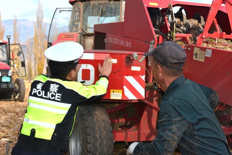 民警正在给农用车辆贴上反光条。通讯员 马燕摄 见到农户正忙着将玉米秸秆装车,民辅警们纷纷上前搭手,有人搬运,有人捆扎,忙碌的田间跃动着一抹温暖的“荧光绿”。“你们不仅讲安全,还帮我们干活,太贴心了!”农户海沙尔擦着汗感慨道。