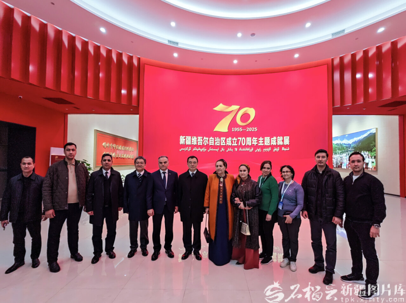 11月5日,部分参加第十二届中国—中亚合作论坛的多国代表团嘉宾在主题成就展现场拍照留念。 石榴云/新疆日报讯(记者 周鹏摄影报道)11月5日,参加第十二届中国—中亚合作论坛的多国代表团嘉宾走进新疆维吾尔自治区成立70周年主题成就展现场,通过丰富的实物展品、翔实的数据图表及生动的影像资料,沉浸式感受新疆70年来的沧桑巨变,为深化合作注入新共识。