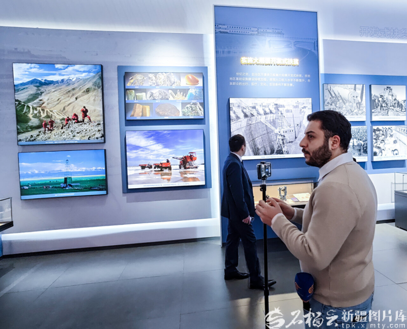 11月5日,一名参加第十二届中国—中亚合作论坛的外国记者在新疆维吾尔自治区成立70周年主题成就展现场采访拍摄。