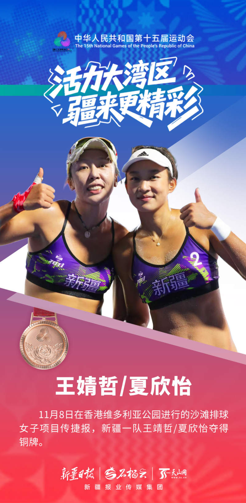 11月8日在香港维多利亚公园进行的沙滩排球女子项目传捷报,新疆一队王靖哲/夏欣怡夺得铜牌。