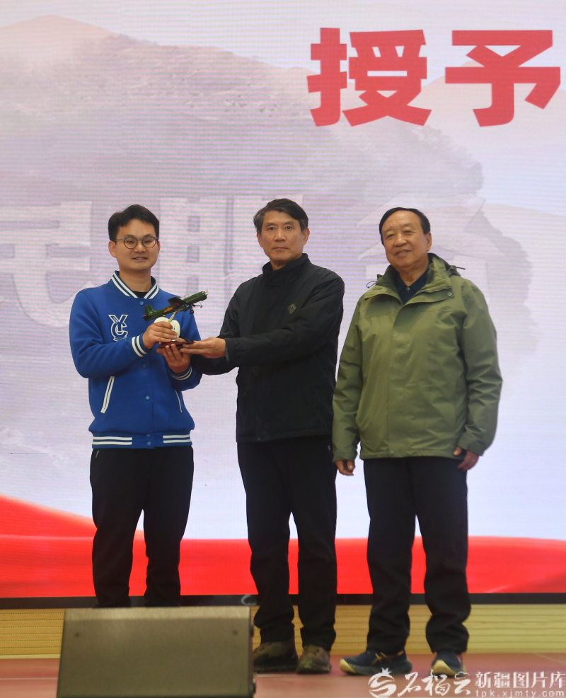 11月6日,空军老战士代表卢建华(右)、韩郑(中)向陆遥(左)赠送“初教六”飞机模型。石榴云/新疆日报记者 邹懿摄 这段历史,卢建华和韩郑曾亲历过——上世纪60年代,他们是位于哈密的中国人民解放军第八航空学校(简称:第八航校)的学员,航校在茫茫戈壁上刻下的“为人民服务”“只争朝夕”等5处飞行地标,陪伴着他们和战友完成一次次飞行训练。 今年11月11日,中国人民解放军空军成立76周年,在这具有纪念意义日子到来之际,空军老战士不远千里前来馈赠飞机模型,陆遥认为这是最珍贵的礼物。 而众人从空军老战士满脸的欣慰中、与陆遥紧紧的握手中不难看出,陆遥远道而来修复受到损坏的“为人民服务”飞行地标的壮举,唤醒了沉睡的精神地标,这种“双向奔赴”,弥足珍贵。 一个飞行地标修复,一次精神坐标传承。从承载“为人民服务”飞行地标的哈密大地,到传承“为人民服务”的网络大众,全民都在守护“为人民服务”这个共同的信仰。 初心如炬,戈壁滩上的自发守护 前不久,一则“新疆哈密戈壁滩‘为人民服务’大字遭到破坏,网友驱车2000多公里修复”的视频在网络引发广泛关注。是谁在这句经典语录上搞破坏?网友很气愤;是谁对此进行了修复?网友很温暖。 哈密戈壁滩上的“为人民服务”大字,正是第八航校的一处飞行地标;驱车2000多公里修复的网友,正是陆遥。 陆遥是中国汽车互联网平台企业易车网成都工作室的视频编导,该工作室负责人是哈密人。今年8月,工作室讨论选题时,这位负责人和陆遥的一个哈密朋友推荐他去哈密拍摄“为人民服务”等飞行地标。 “他们只知道这些地标是当年空军飞行员训练用的,别的也不太清楚。直觉告诉我,这背后一定有故事。”11月6日,陆遥在哈密接受记者专访时说。