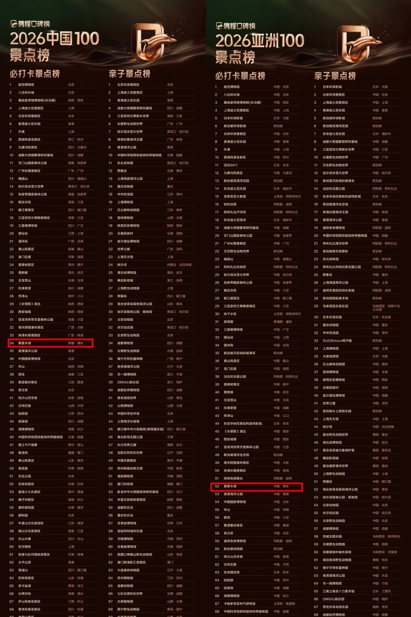 近日,携程口碑榜《2026中国100景点榜》、《2026亚洲100景点榜》“出炉”,赛里木湖登上“2026中国100必打卡景点榜”第34名,“2026亚洲100必打卡景点榜”第52名。