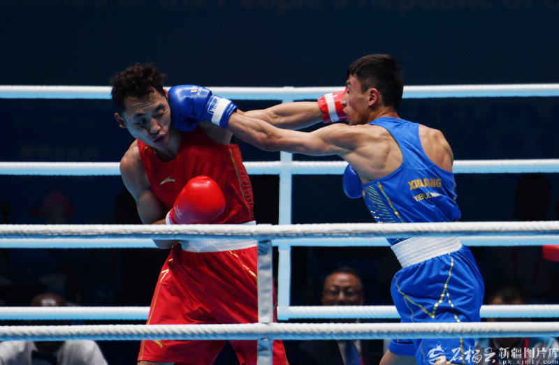11月11日,在深圳市宝安体育中心体育馆,拳击男子60—63.5公斤级四分之一决赛中,新疆拳击运动员伊卜拉伊木・马木提(蓝)与四川省拳击队运动员金鑫(红)在比赛中。