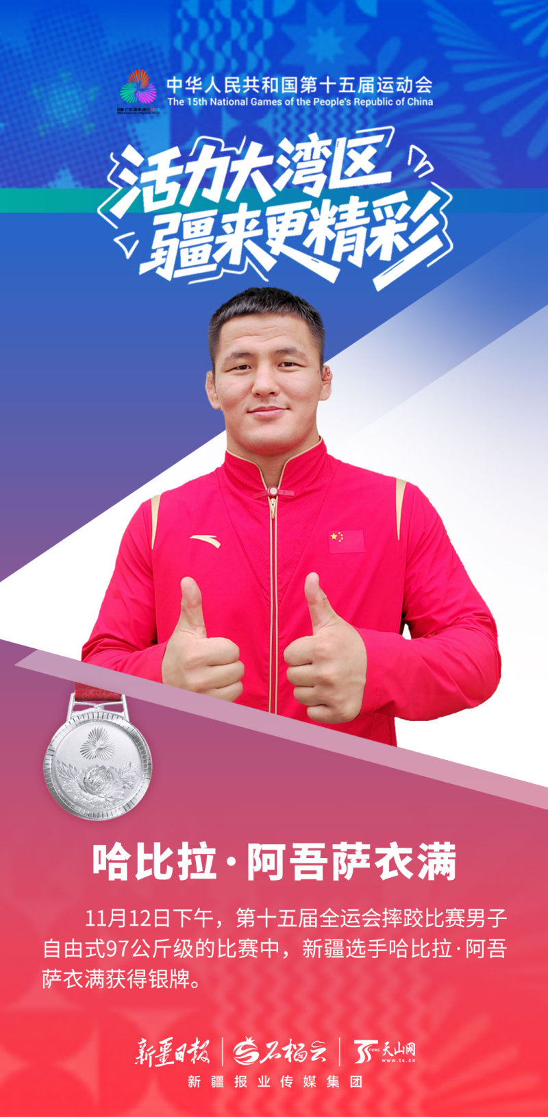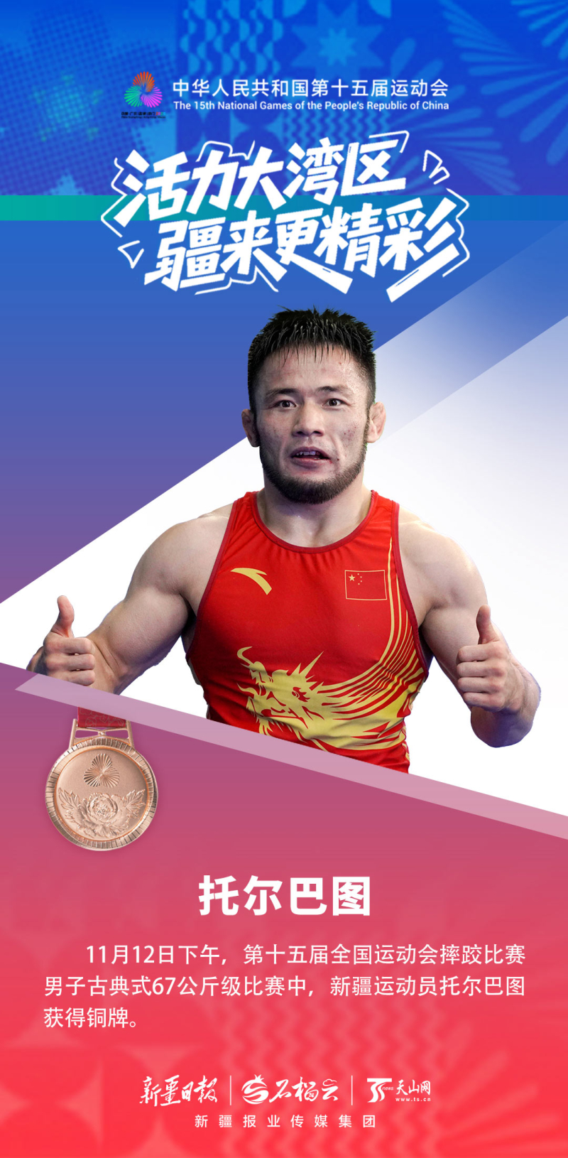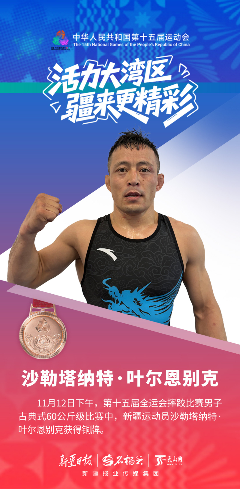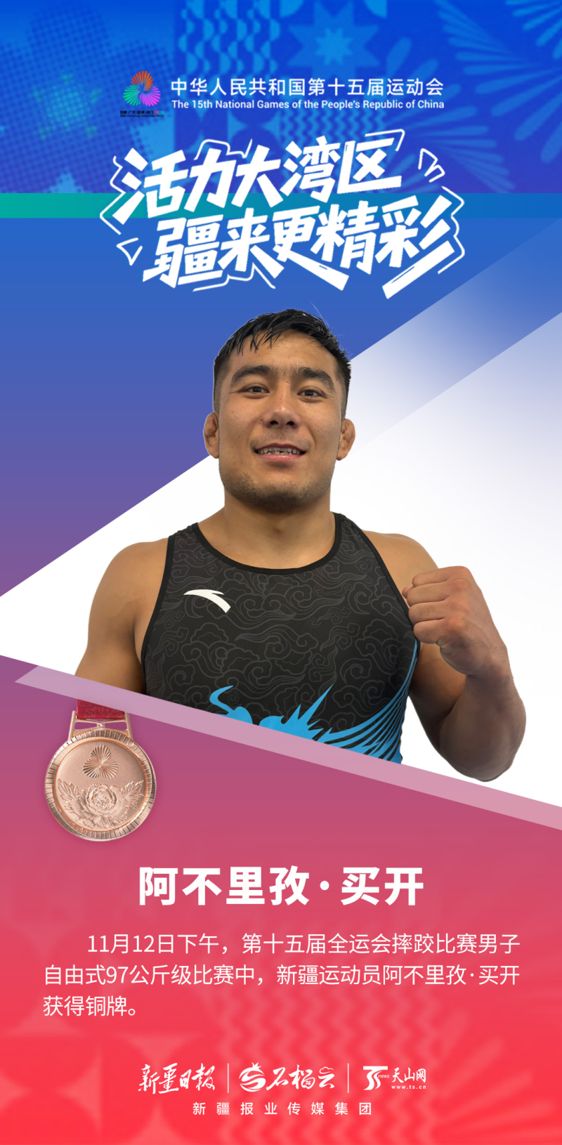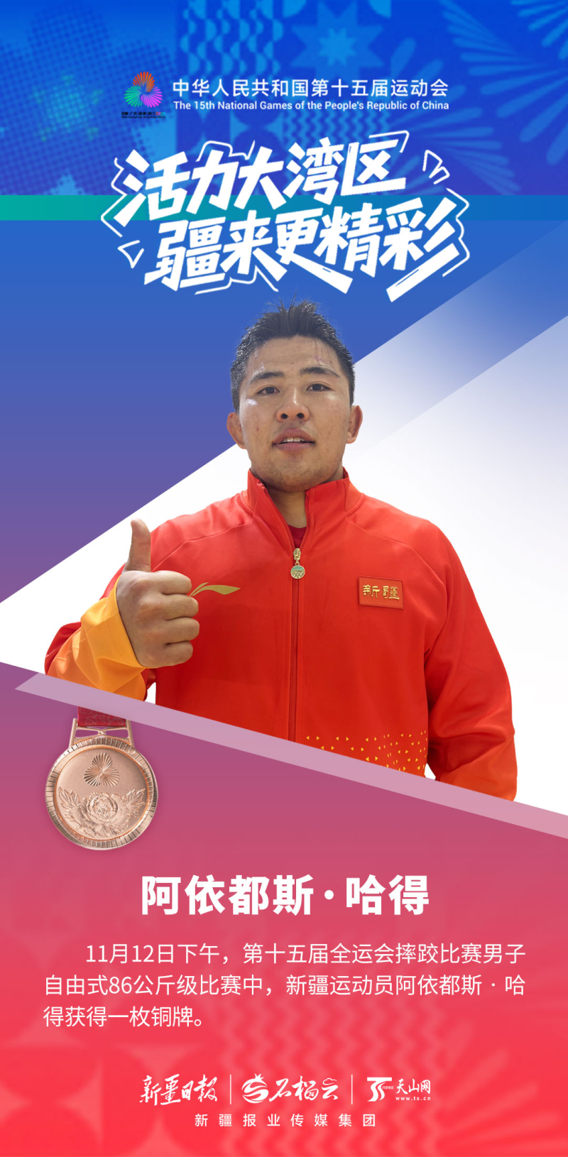 阿不里孜是第二次征战全运会,在铜牌争夺战中上演高光时刻——仅用58秒就战胜对手,以一场酣畅淋漓的胜利斩获铜牌。赛后采访时,他分享了自己的甜蜜——赛后回家乡和静县,他将迎娶相恋9年的女友。“这是双喜临门。感谢家人、感谢未婚妻,今后我会更加努力。”他说。