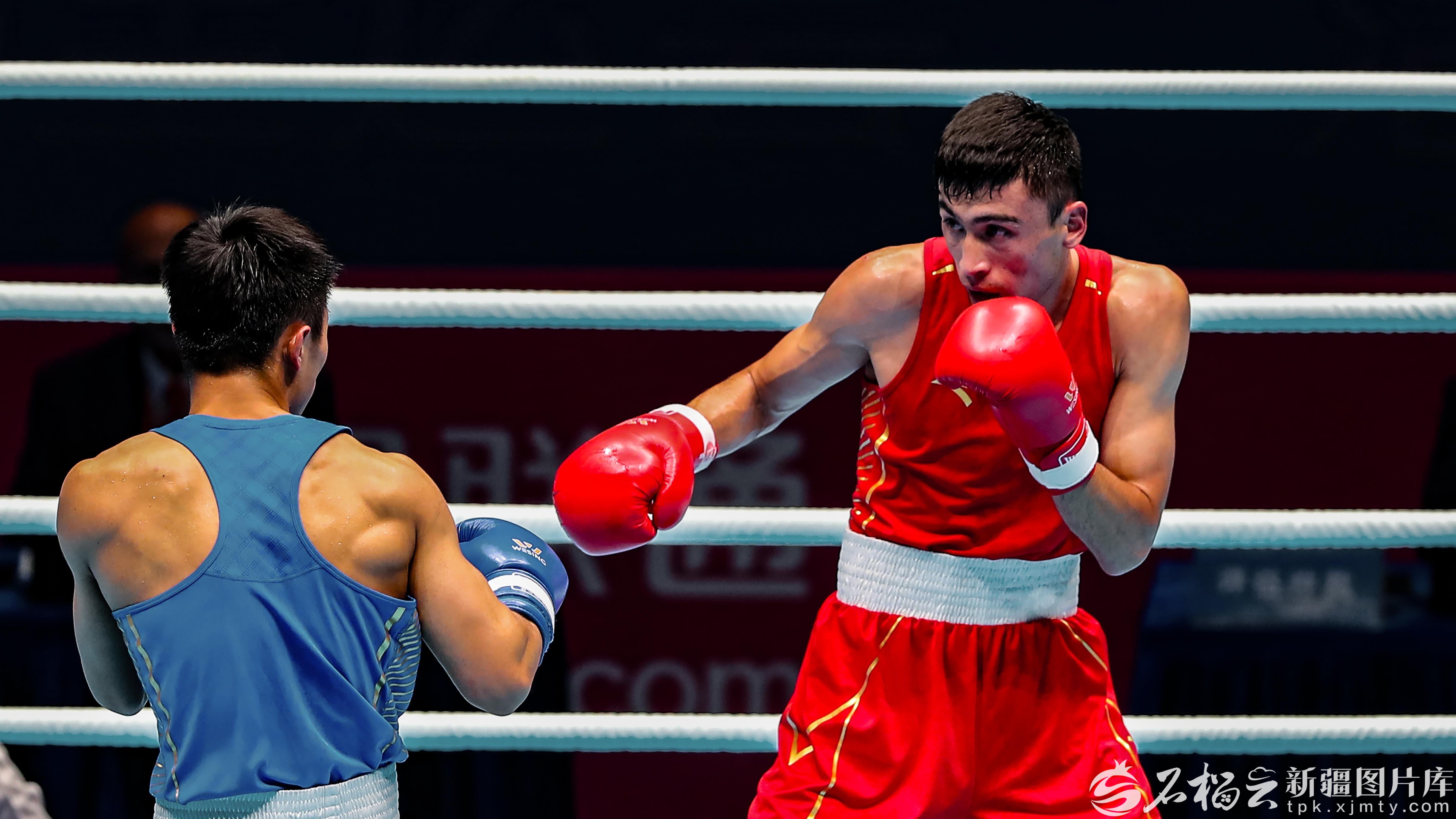 11月14日,新疆拳击运动员伊卜拉伊木·马木提(红)与广东队选手朱健豪(蓝)在比赛中。