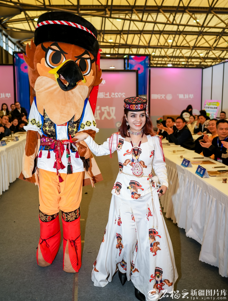 11月13日,百合提妮莎·甫拉提夏(右)带着吉祥物“帕米尔雄鹰—阿米尔”进行IP人偶服角色秀。 “帕米尔雄鹰—阿米尔”吉祥物以鹰的形象为核心,运用拟人化的艺术手法,对雄鹰形象注入现代审美,生动展现生活在帕米尔高原的塔吉克族勇敢、坚毅、顽强、忠诚的特质。 “我们带着帕米尔高原上非遗的多彩表达走上全国大赛奖台,感到十分自豪,希望通过阿米尔这个吉祥物,让更多人知道新疆帕米尔高原上那些感人的故事。”百合提妮莎说。