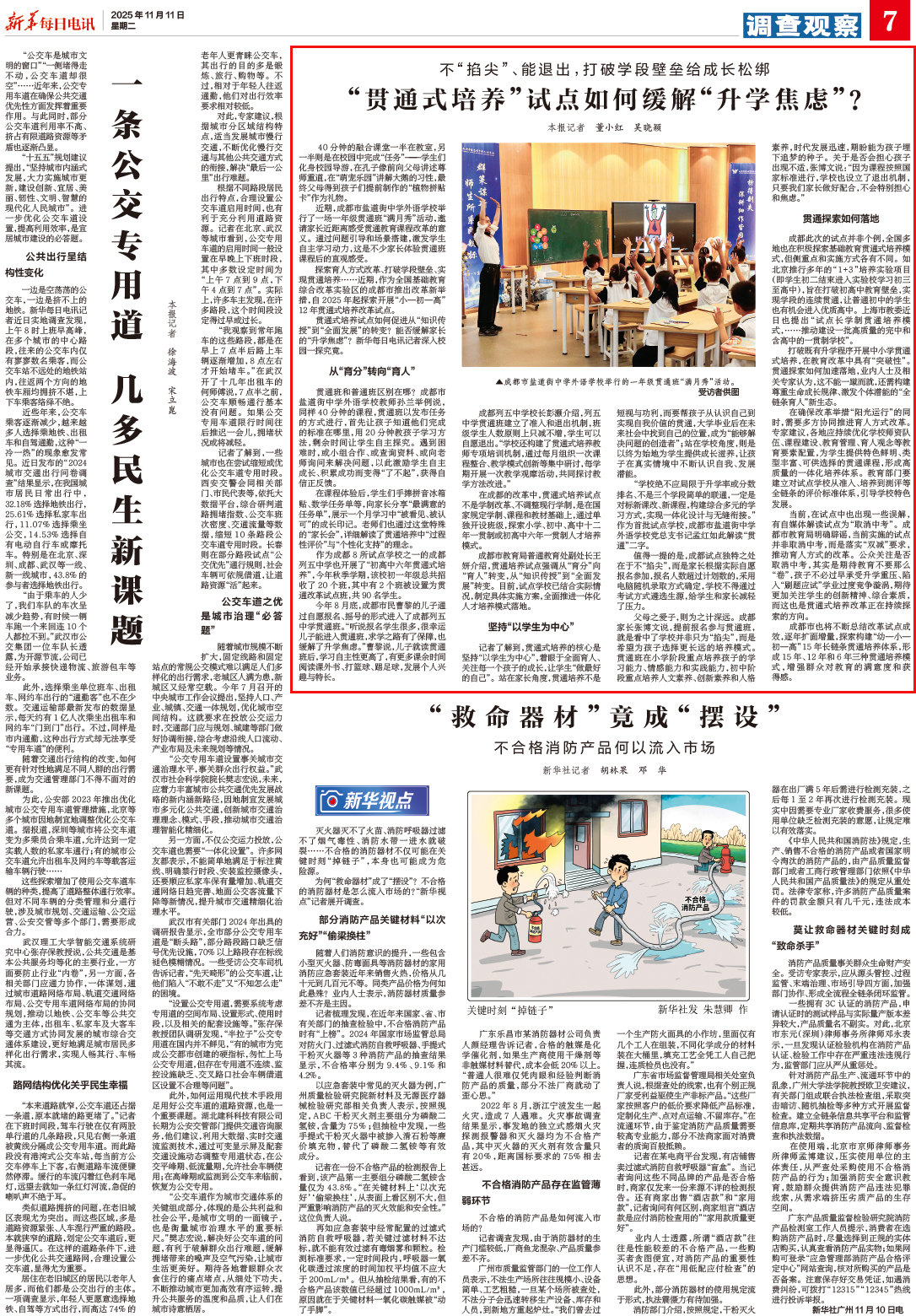 来源:11月11日《新华每日电讯》 作者:新华每日电讯记者董小红 吴晓颖 40分钟的融合课堂一半在教室,另一半则是在校园中完成“任务”——学生们化身校园导游,在孔子像前向父母讲述尊师重道,在“萌宠乐园”讲解大鹅的习性,最终父母得到孩子们提前制作的“植物拼贴卡”作为礼物。 成都市盐道街中学外语学校举行的一年级贯通班“满月秀”活动。受访者供图 近期,成都市盐道街中学外语学校举行了一场一年级贯通班“满月秀”活动,邀请家长近距离感受贯通教育课程改革的意义。通过问题引导和场景搭建,激发学生自主学习动力,这是不少家长体验贯通班课程后的直观感受。 探索育人方式改革、打破学段壁垒、实现贯通培养……近期,作为全国基础教育综合改革实验区的成都市推出改革新举措,自2025年起探索开展“小—初—高”12年贯通式培养改革试点。 贯通式培养试点如何促进从“知识传授”到“全面发展”的转变?能否缓解家长的“升学焦虑”?新华每日电讯记者深入校园一探究竟。 从“育分”转向“育人” 贯通班和普通班区别在哪?成都市盐道街中学外语学校教师孙兰举例说,同样40分钟的课程,贯通班以发布任务的方式进行,首先让孩子知道他们完成的标准在哪里,用20分钟教孩子学习方法,剩余时间让学生自主探究。遇到困难时,或小组合作、或查询资料、或向老师询问来解决问题,以此激励学生自主成长、积累成功而变得“了不起”,获得自信正反馈。 在课程体验后,学生们手捧拼音冰箱贴、数学任务单等,向家长分享“最满意的任务单”,展示一个月学习中“被看见、被认可”的成长印记。老师们也通过这堂特殊的“家长会”,详细解读了贯通培养中“过程性评价”与“个性化支持”的理念。 作为成都8所试点学校之一的成都列五中学也开展了“初高中六年贯通式培养”,今年秋季学期,该校初一年级总共招收了20个班,其中有2个班被设置为贯通改革试点班,共90名学生。 今年8月底,成都市民曹黎的儿子通过自愿报名、摇号的形式进入了成都列五中学贯通班。“听说报名学生很多,很幸运儿子能进入贯通班,求学之路有了保障,也缓解了升学焦虑。”曹黎说,儿子就读贯通班后,学习自主性更高了,有更多课余时间阅读课外书、打篮球、踢足球,发展个人兴趣与特长。 成都列五中学校长彭灏介绍,列五中学贯通班建立了准入和退出机制,班级学生人数原则上只减不增,学生可以自愿退出。“学校还构建了贯通式培养教师专项培训机制,通过每月组织一次课程整合、教学模式创新等集中研讨,每学期开展一次教学观摩活动,共同探讨教学方法改进。” 成都市盐道街中学外语学校小一贯通试点班英语课现场。受访者供图 在成都的改革中,贯通式培养试点不是学制改革、不调整现行学制,是在国家规定学制、课程和教材基础上,通过单独开设班级,探索小学、初中、高中十二年一贯制或初高中六年一贯制人才培养模式。 成都市教育局普通教育处副处长王妍介绍,贯通培养试点强调从“育分”向“育人”转变,从“知识传授”到“全面发展”转变。目前,试点学校已结合实际情况,制定具体实施方案,全面推进一体化人才培养模式落地。 坚持“以学生为中心” 记者了解到,贯通式培养的核心是坚持“以学生为中心”,着眼于全面育人、关注每一个孩子的成长,让学生“做最好的自己”。站在家长角度,贯通培养不是短视与功利,而要帮孩子从认识自己到实现自我价值的贯通,大学毕业后在未来社会中找到自己的位置,成为“能够解决问题的创造者”;站在学校角度,则是以终为始地为学生提供成长滋养,让孩子在真实情境中不断认识自我、发展潜能。 “学校绝不应局限于升学率或分数排名、不是三个学段简单的联通,一定是对标新课改、新课程,构建综合多元的学习方式,实现一体化设计与无缝衔接。”作为首批试点学校,成都市盐道街中学外语学校党总支书记孟红如此解读“贯通”二字。 值得一提的是,成都试点独特之处在于不“掐尖”,而是家长根据实际自愿报名参加,报名人数超过计划数的,采用电脑随机录取方式确定,学校不得通过考试方式遴选生源,给学生和家长减轻了压力。 父母之爱子,则为之计深远。成都家长张博文说,提前报名参与贯通班,就是看中了学校并非只为“掐尖”,而是希望为孩子选择更长远的培养模式。贯通班在小学阶段重点培养孩子的学习能力、情感能力和实践能力,初中阶段重点培养人文素养、创新素养和人格素养,时代发展迅速,期盼能为孩子埋下追梦的种子。关于是否会担心孩子出现不适,张博文说:“因为课程按照国家标准进行,学校也设立了退出机制,只要我们家长做好配合,不会特别担心和焦虑。” 贯通探索如何落地 成都此次的试点并非个例,全国多地也在积极探索基础教育贯通式培养模式,但侧重点和实施方式各有不同。如北京推行多年的“1+3”培养实验项目(即学生初二结束进入实验校学习初三至高中),旨在打破初高中教育壁垒,实现学段的连续贯通,让普通初中的学生也有机会进入优质高中。上海市教委近日也提出“试点长学制贯通培养模式,……推动建设一批高质量的完中和含高中的一贯制学校”。 打破既有升学程序开展中小学贯通式培养,在教育改革中具有“突破性”。贯通探索如何加速落地,业内人