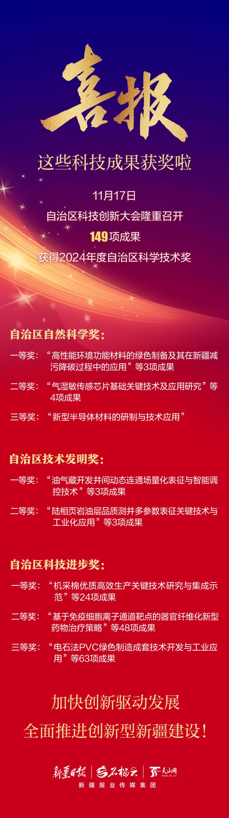 公布的149项获奖科技成果中,自治区自然科学奖共8项(一等奖3项、二等奖4项、三等奖1项),技术发明奖6项(一等奖3项、二等奖3项),科技进步奖135项(一等奖24项、二等奖48项、三等奖63项)。