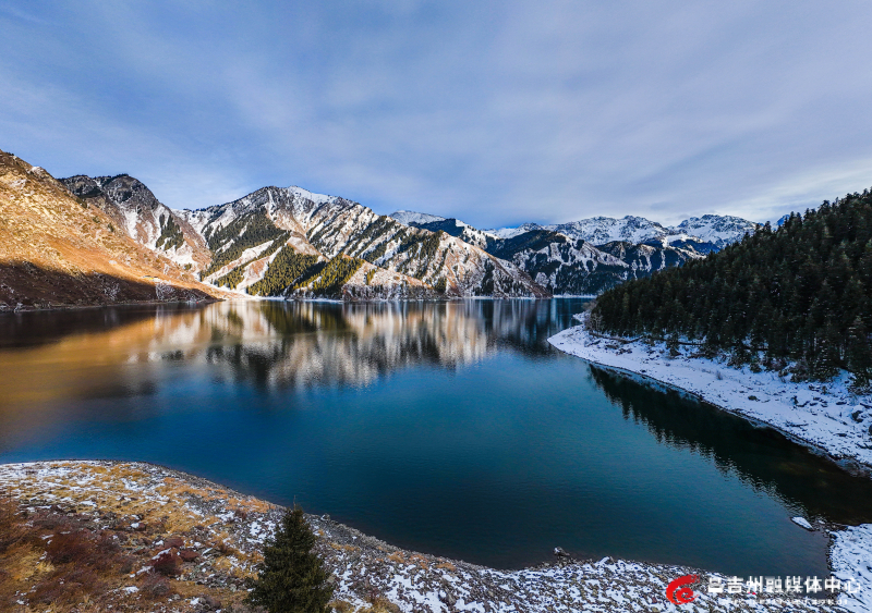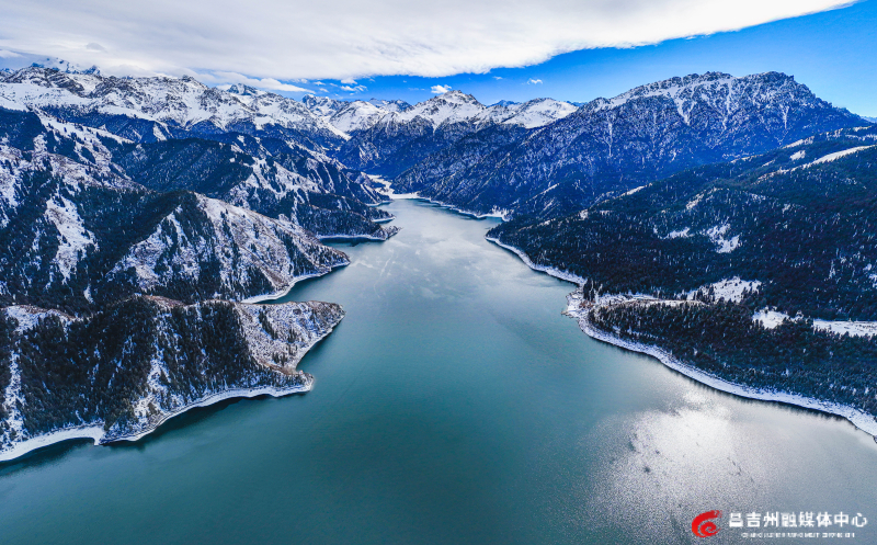 天山天池景区的山峰、池水、森林都被白雪覆盖。