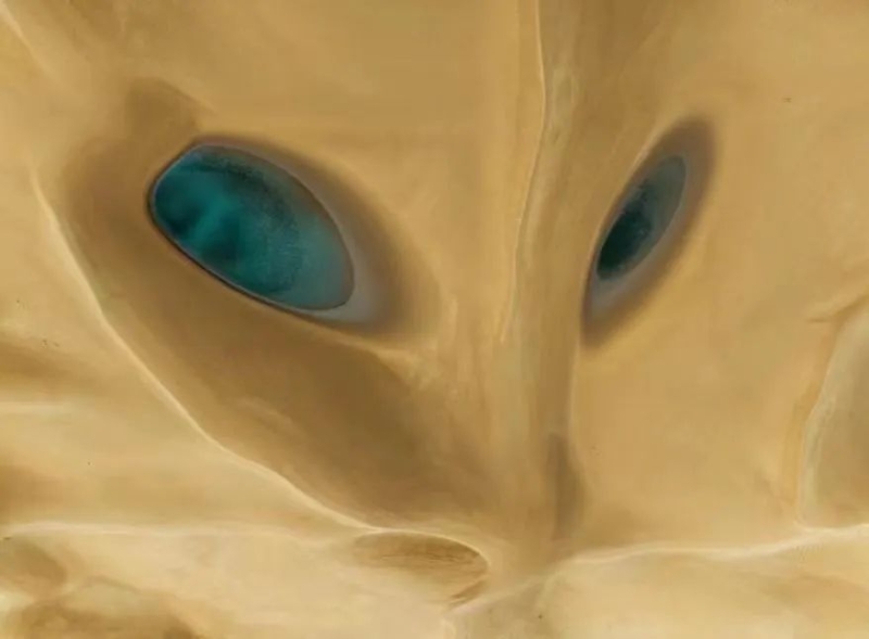 这已经是巴州摄影家第二次在沙漠中与“大地之眼”相遇。此前,家住尉犁县的摄影家王汉冰在库木库里沙漠的雨后,用无人机拍摄了一张名为《沙狐之眼》的图片,简洁而唯美的画面里,两汪碧蓝色的水洼仿佛狐狸一双水灵灵的大眼睛,其神态妩媚,实属罕见。