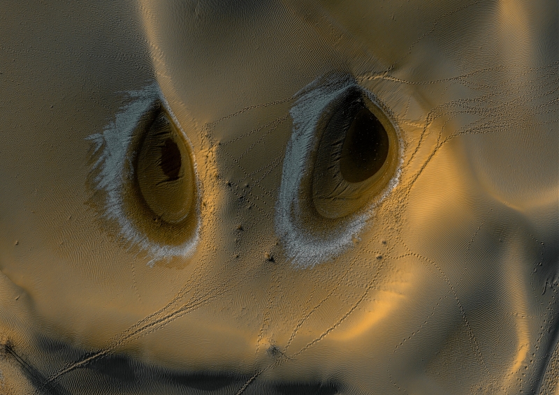 “从天空俯瞰沙漠里的‘这双眼’,会忍不住感叹大自然的鬼斧神工”。11月17日,马立新回忆起10月28日在塔克拉玛干沙漠腹地用无人机拍摄到的“一双眼”,依然震撼不已。流沙在大地上勾勒出一张完整的“面孔”,两个巨大的泉眼如深邃的眼眸,沙梁自然形成的轮廓,恰如微微挺起的鼻梁和眼睛。