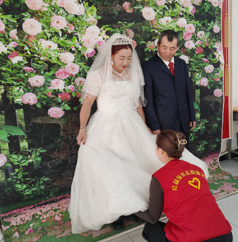 侯辉 近年来,城里的老人拍婚纱照已不是什么新鲜事,但是在帕米尔高原的边境村庄,一群老人身着婚纱礼服,多少还是让人心头一热。 几天前,笔者在谢依特小学走访时,碰巧遇见该小学所在的村——阿图什市哈拉峻乡谢依提村正在组织村里的老人拍婚纱照。在村委会的活动室里,42对老夫妻兴高采烈地化妆、试礼服、婚纱,十分热闹。一位老奶奶腼腆地说:“以前住石头房子,现在有了漂亮院子,还能穿上婚纱,这是从前做梦都不敢想的事。”这场在西部边关地区举行的婚纱摄影活动,是一次迟到的浪漫,更是山河无恙、国泰民安的最美注脚。 在这些“新人”中,有退休的护边员,也有仍在边境线上行走的现役护边员。镜头前,老护边员们略显局促却满眼幸福。他们用双脚丈量祖国的边境线,青春在风沙雪雨中褪色,爱情在聚少离多中沉淀。今天婚纱取代了巡边服,洁白头纱覆盖着道道皱纹交织的脸,他们守护的边关此刻正以特别的方式,回馈给他们一场温柔的岁月仪式。