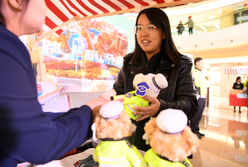 11月28日,自治区公安厅交管总队在乌鲁木齐德汇万达广场举行“全国交通安全日”预热活动,市民领取礼物“交警小熊”。