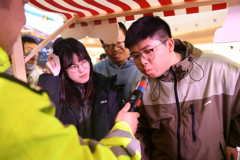 11月28日,自治区公安厅交管总队在乌鲁木齐德汇万达广场举行“全国交通安全日”预热活动,市民在交通安全宣传活动中体验酒驾测试仪。
