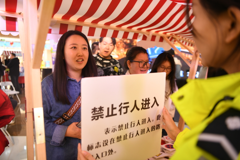 11月28日,自治区公安厅交管总队在乌鲁木齐德汇万达广场举行“全国交通安全日”预热活动,市民在交通安全宣传活动中辨认交通安全标志。