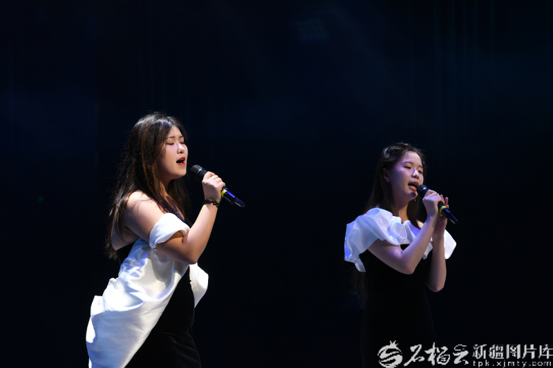 来自库车的西部计划志愿者陈盈颖、赵畅、欧晓君演唱原创歌曲《库车青春志》。石榴云/新疆日报记者 秦梅花摄