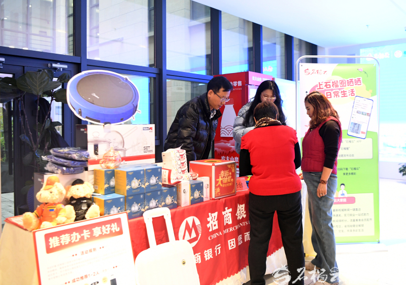 观众在招商银行股份有限公司乌鲁木齐分行服务台参与互动。石榴云/新疆日报记者 秦梅花摄