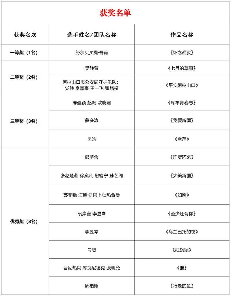 比赛现场,评委从歌唱技巧、歌曲表现、舞台形象等方面进行综合评定,评出一等奖1名、二等奖2名、三等奖3名及优秀奖8名。