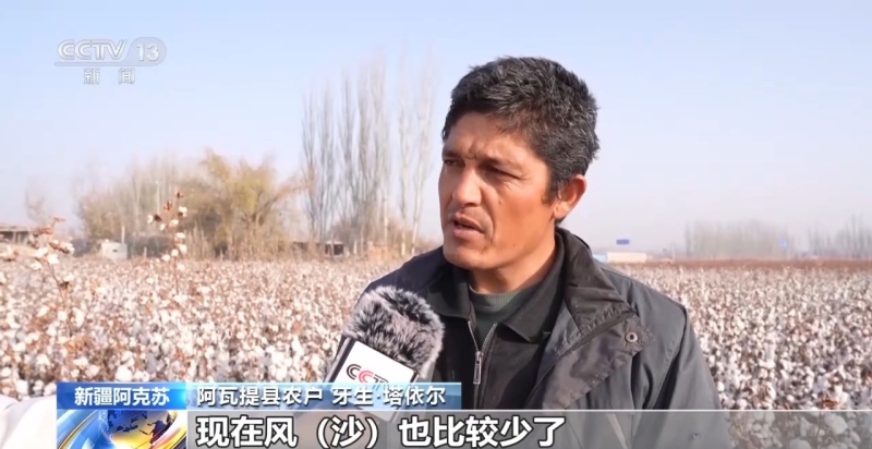 阿瓦提县农户 牙生·塔依尔:种树之后天气变得很好,现在风沙也比较少了,棉花白白的,以前棉花上黄黄的,土太多了,以前一亩地200到250公斤,现在350公斤。