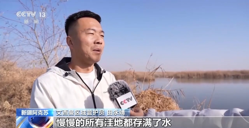 艾西曼区域管护员 田永靖:再生水过来之后,慢慢所有洼地都存满了水,变成了现在所看到的湿地,这一大片的芦苇现在长势都特别不错。