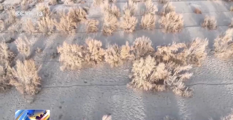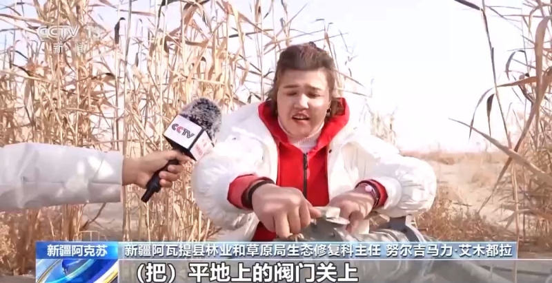 新疆阿瓦提县林业和草原局生态修复科主任 努尔吉马力·艾木都拉:把平地上的阀门关上,然后把全部压力给到高处沙包上的滴灌管道。再生水来了,水源充足以后,现在成活率达到75%以上了。