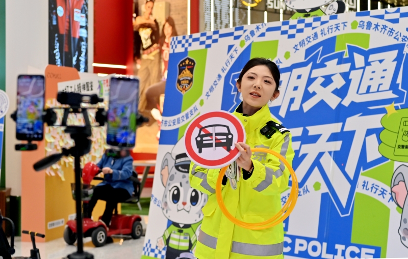 12月1日,乌市公安局交管支队民警在CCMALL商场,通过直播的形式向网友宣传交通安全知识。石榴云/新疆法治报记者 单坤摄 石榴云/新疆法治报讯(记者 单坤报道)今年12月2日是第十四个“全国交通安全日”,主题为“文明交通 礼行天下”。连日来,乌鲁木齐市公安局交通管理支队各大队创新形式,在全市范围内开展系列交通安全宣传活动,以趣味互动、知识普及、跨界融合等多元方式将交通安全理念传递给广大市民。