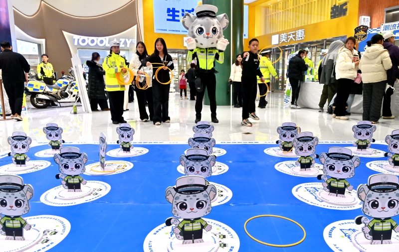 12月1日,在CCMALL商场“全国交通安全日”宣传活动现场,市民在套圈答题。石榴云/新疆法治报记者 单坤摄 12月1日,乌市公安局交管支队城市快速路大队走进CCMALL商场,打造了一场集趣味互动、印章解锁等特色环节于一体的交通安全“派对”,生动有趣的活动形式吸引众多市民及小朋友参与,在欢乐氛围中学习交通安全知识。