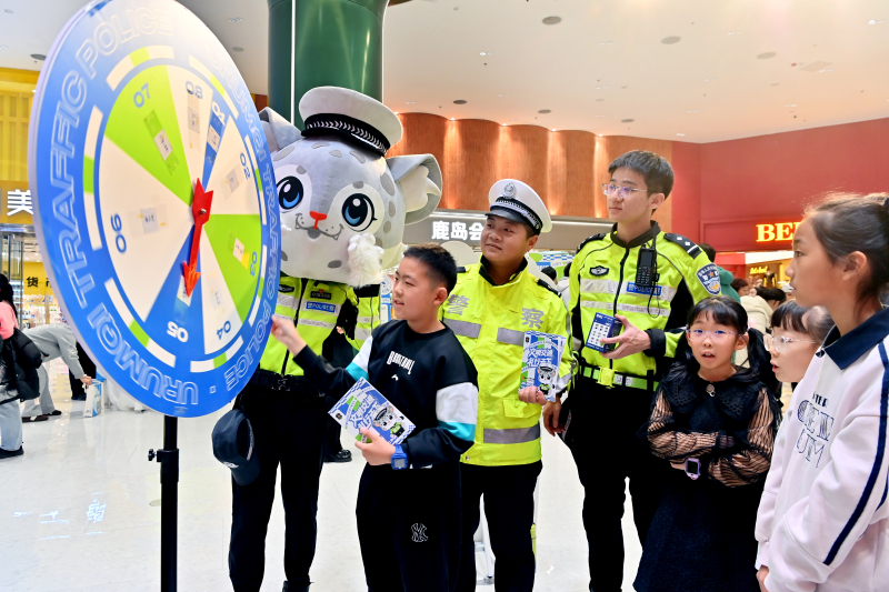 12月1日,乌市公安局交管支队城市快速路大队民警在CCMALL商场,带领市民答题赢奖品。石榴云/新疆法治报记者 单坤摄 同日,沙依巴克区大队创新推出“文物+交通”跨界宣传活动,走进新疆维吾尔自治区博物馆以“线上直播互动+线下沉浸式体验”双重模式,让交通安全知识沿着历史文脉走进千家万户。