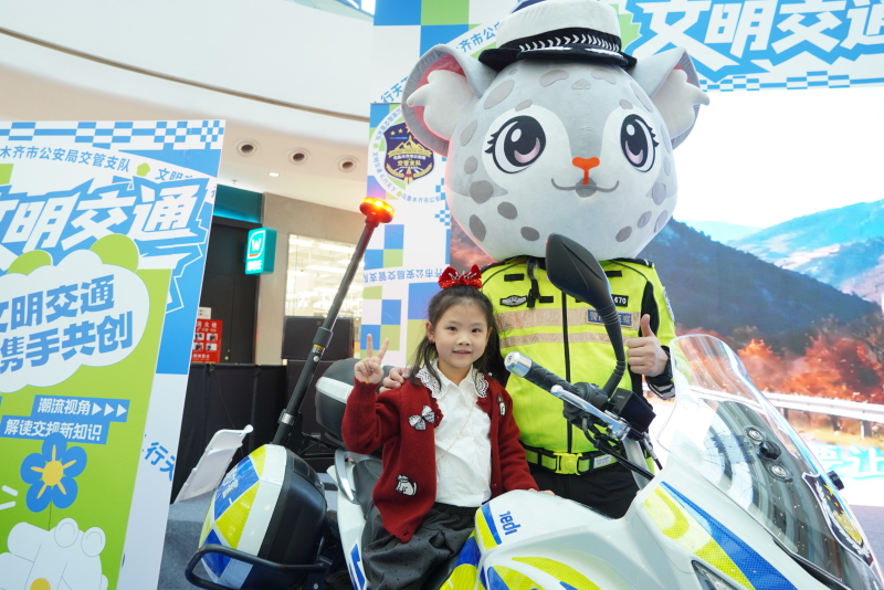 11月28日,在乌市公安局交管支队高新区(新市区)大队宣传活动现场,小朋友和天山雪豹合影。通讯员 李光琦摄