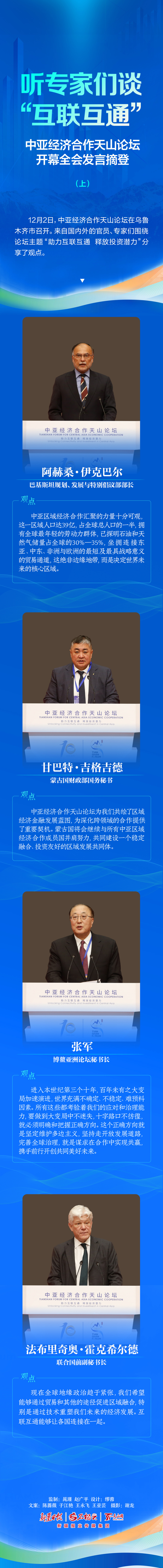 12月2日,中亚经济合作天山论坛在乌鲁木齐市召开。来自国内外的官员、专家们围绕论坛主题“助力互联互通 释放投资潜力”分享了观点。
