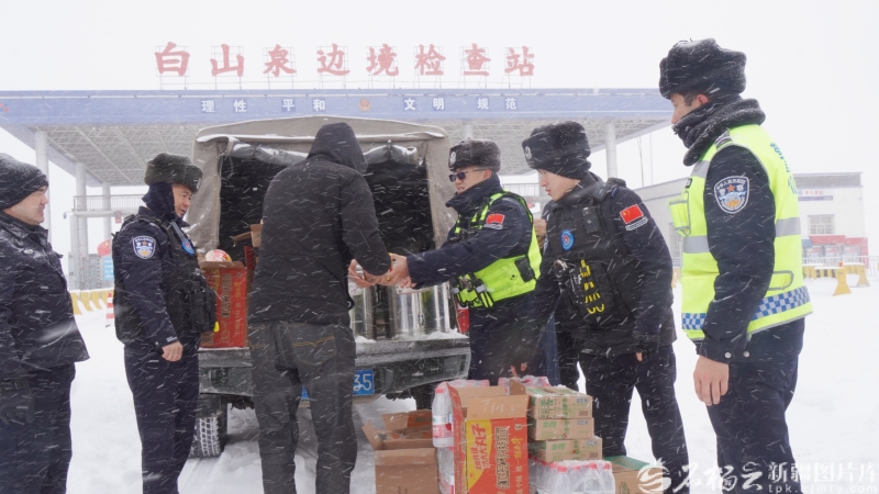 12月11日,救援人员为滞留在白山泉边境检查站的旅客发放物资。何鹏飞 摄