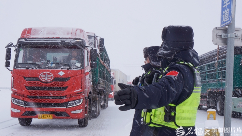 12月11日,白山泉边境检查站民警在风雪中维护交通秩序。何鹏飞 摄
