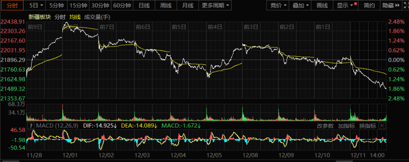 创业板指数近十日变化趋势(来源:东方财富)。 12月11日收盘时,新疆板块指数跌1.91%,报收21478.69点,7只股票上涨,51只股票下跌,3只股票平盘,个股上涨比例为11.48%,总换手率1.83%,总成交额237.85亿元。