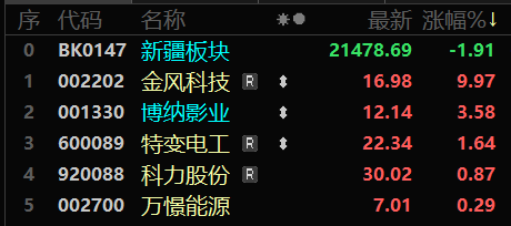 新疆板块指数近十日变化趋势(来源:东方财富)。 今日,金风科技上涨9.97%,报收16.98元;博纳影业上涨3.58%,报收12.14元;特变电工上涨1.64%,报收22.34元;科力股份上涨0.87%,报收30.02元;万憬能源上涨0.29%,报收7.01元。西部牧业、天富能源、麦趣尔、天顺股份、合金投资跌幅居前。