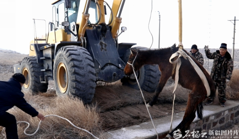 12月10日,在博乐市博尔塔拉河二级水电站区域,民警利用铲车采取“人机配合”的方式,成功将被困滤水池底的马匹救出。朱晓彤摄